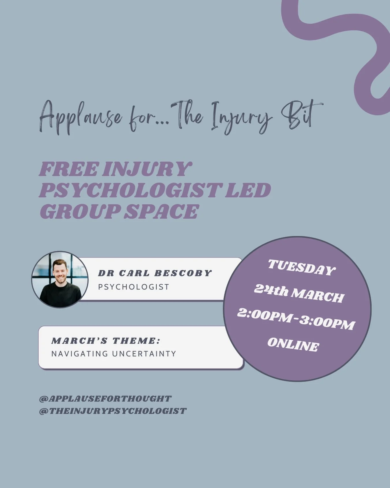 Join us online for a one hour free monthly listening. andsharing space for anyone who is in recovery from an injury.